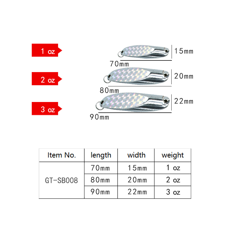 Product size: Weight (g):1oz 2oz 3oz Length(mm):70mm 80mm 90mm