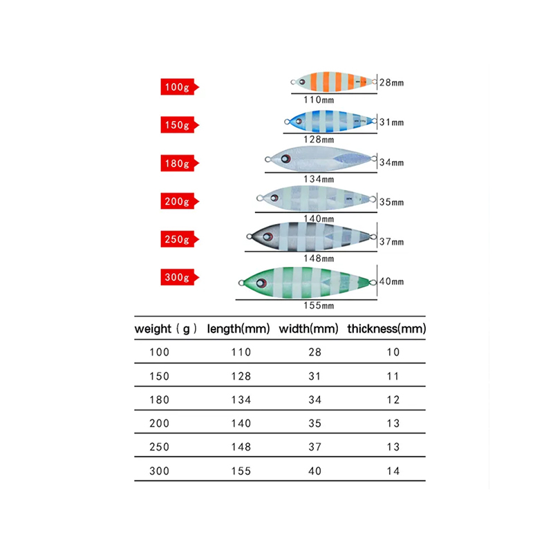 Product size: Weight(g):100、150、180、200、250、300 Length(mm):110、128、134、140、148、155